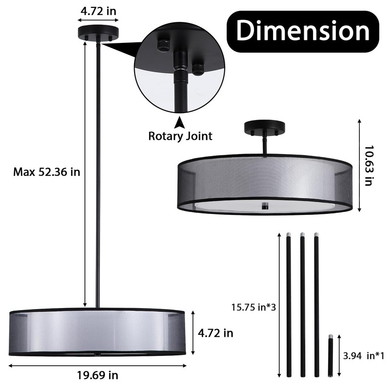 - Adjustable Height for Hanging or Semi Flush Mode: Swap between a classic 57.87" black chandelier light fixture or a sleek 10.63" semi flush mount ceiling light with the supplied 4 metal rods. Adapt lighting height effortlessly for any room