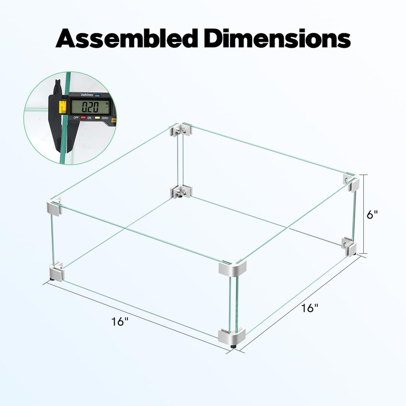 BriSunshine 16" x 16" x 6" Glass Wind Guard for Propane Gas Fire Pit Table, Square Thick Tempered Glass Shield, Firepit Glass Barrier with Aluminum Corner Bracket & Rubber Feet