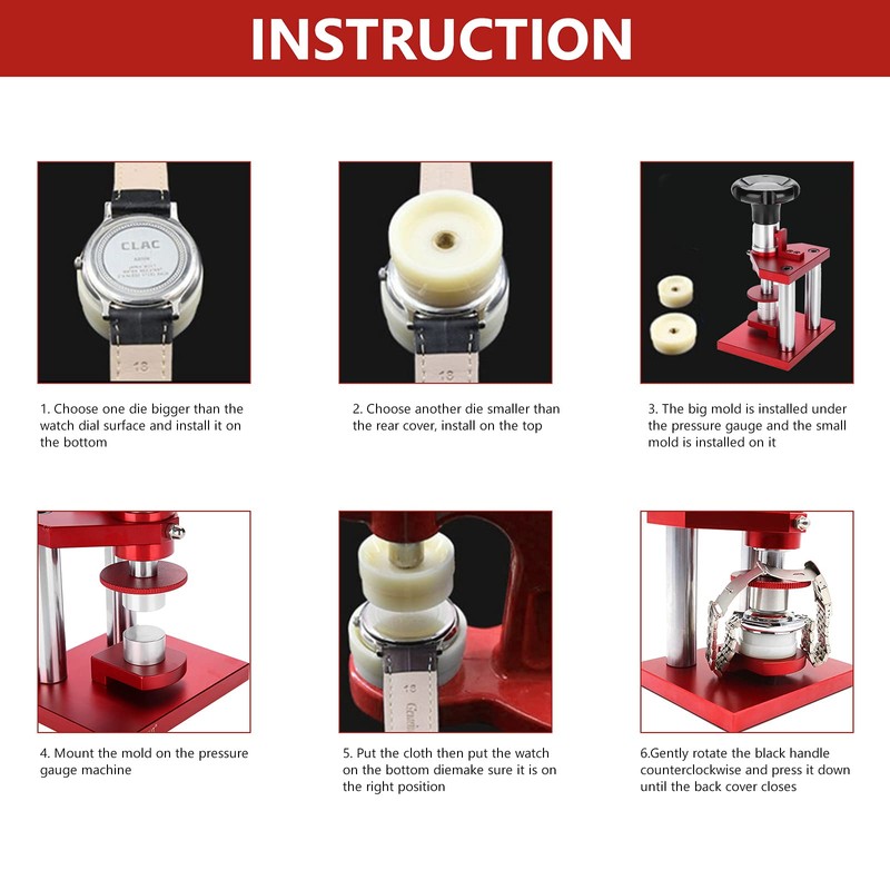 • INSTRUCTIONS: Choose a die which is bigger than the watch crystal and install it at screw-socket of under pliers. Choose other die which is smaller than the rear cover and install it at screw-socket of up pliers. Put a watch crystal adown at the under die and put the rear cover at a suitable position. Lightly press down. Putting a cloth under the watch crystal will protect the watch crystal.