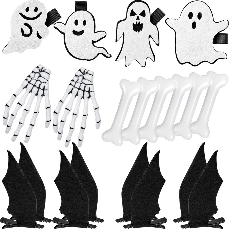 - Contenido del paquete: viene con 20 clips de pelo de Halloween en 7 patrones diferentes, incluyendo 8 alas de murciélago, 4 formas de fantasma, 6 huesos blancos y 2 garras de hueso, cantidad adecuada y patrones abundantes para satisfacer tus diversas necesidades de disfraces.