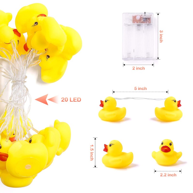 **Feature:** Material: ABS+BC Shape: Duck Bulb: LED Bulb color:Yellow Light color: Warm White Length:3 m/ 9.8 ft Number of lights:20 LEDs available lighting modes: Steady on Beam Angle:360 degrees Waterproof:IP44 Power source:3 AA Battery case total (not included) Available: outdoor and indoor(such as: Party, wedding, etc) Its safety is with CE and RoHS certification. **Description:** We made no any decorations to the pictures,you will get the products exactly the same with pictures. This string lights designed specially for kids who has sapce man dream,it is a good choice for their birthday party. Nursery or Kids room Decor, Wedding Decor, Around the cake table, Garden, Party Patio, String them along your fence, Christmas Tree Decorations, Night Lights. **Note:** ◆ The battery box is not waterproof; please keep it away from the damp place. ◆ Powered by 3 x AA batteries, and batteries are NOT INCLUDED. **Package included:** 1 x 20 Duck Shape LED String Lights