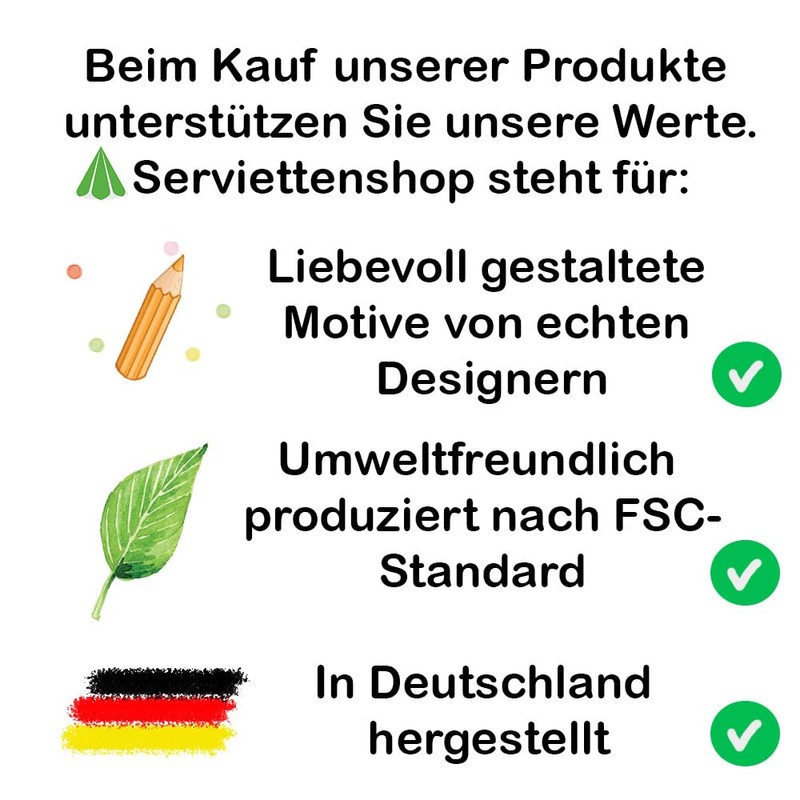 We offer the most beautiful designs from the napkin collection from the most famous German manufacturers. These stand for environmentally conscious and gentle production. The trendy motifs make every meal a pleasurable experience. Of course, the napkins can also be used for decoupage crafts. One pack contains 20 napkins.