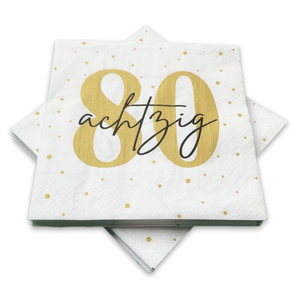 20 Napkins for 80th Birthday 33 x 33 cm White Gold Black
