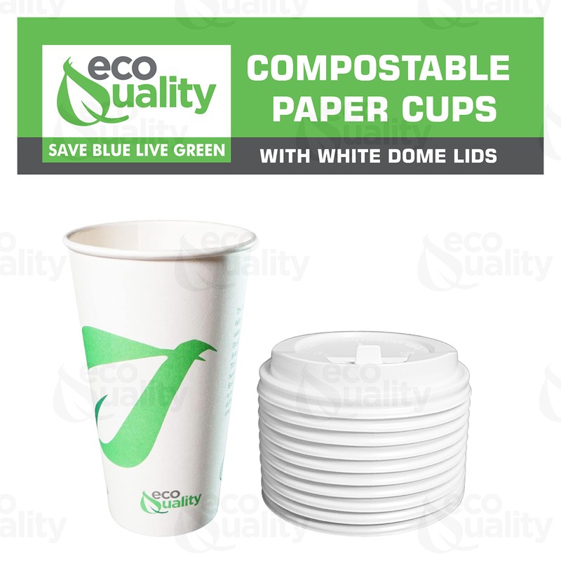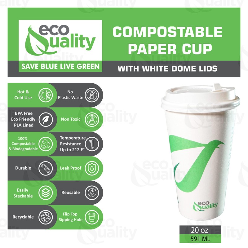20 oz White Paper Compostable Biodegradable Paper Cups with White Dome Lids