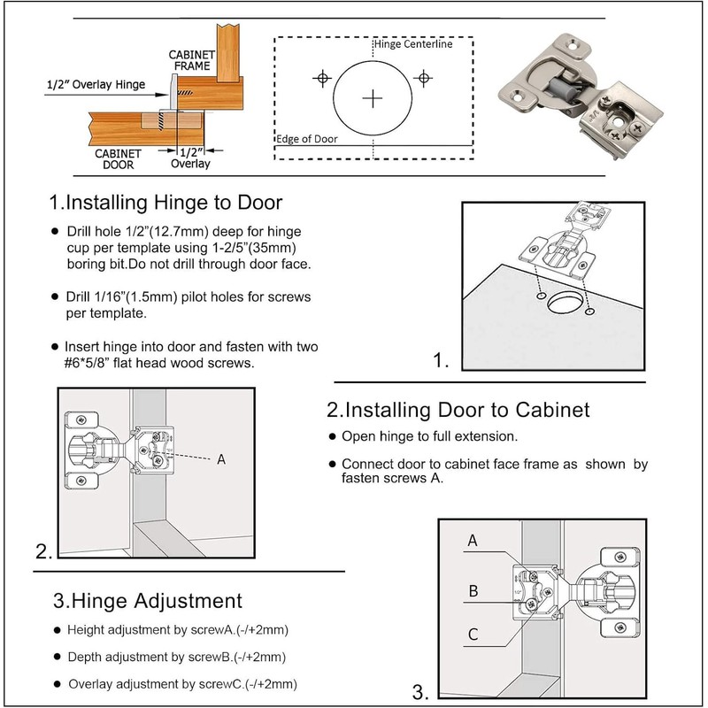 - PRODUCT FEATURE: 1/2 inch Overlay Soft Close Cabinet Hinge Fits for face frame cabinets, kitchen cabinet doors, wardrobe, tv cabinets, bookcases etc. 3 way adjustable will make sure that your new custom-made cabinet doors don't sag, align correctly and open and close smoothly. They're easily installed requiring minimal carpentry skills