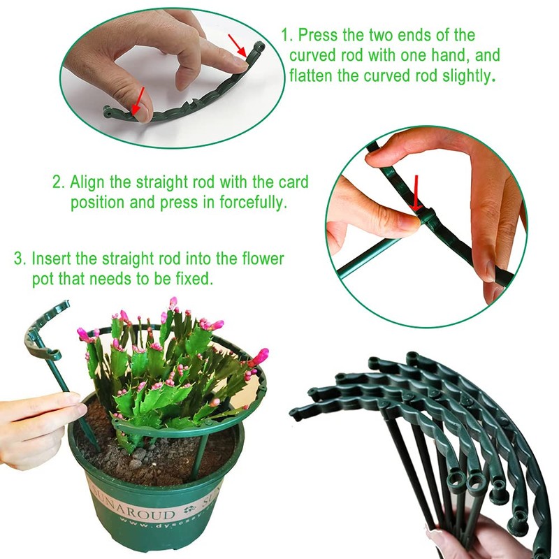 - 【Convenient Installation】Press both ends of the curved rod with one hand, flatten the curved rod slightly, and the straight rod can be easily snapped into the buckle. There are buckles between each bracket to form a circle, and then the straight rod is inserted into the soil.