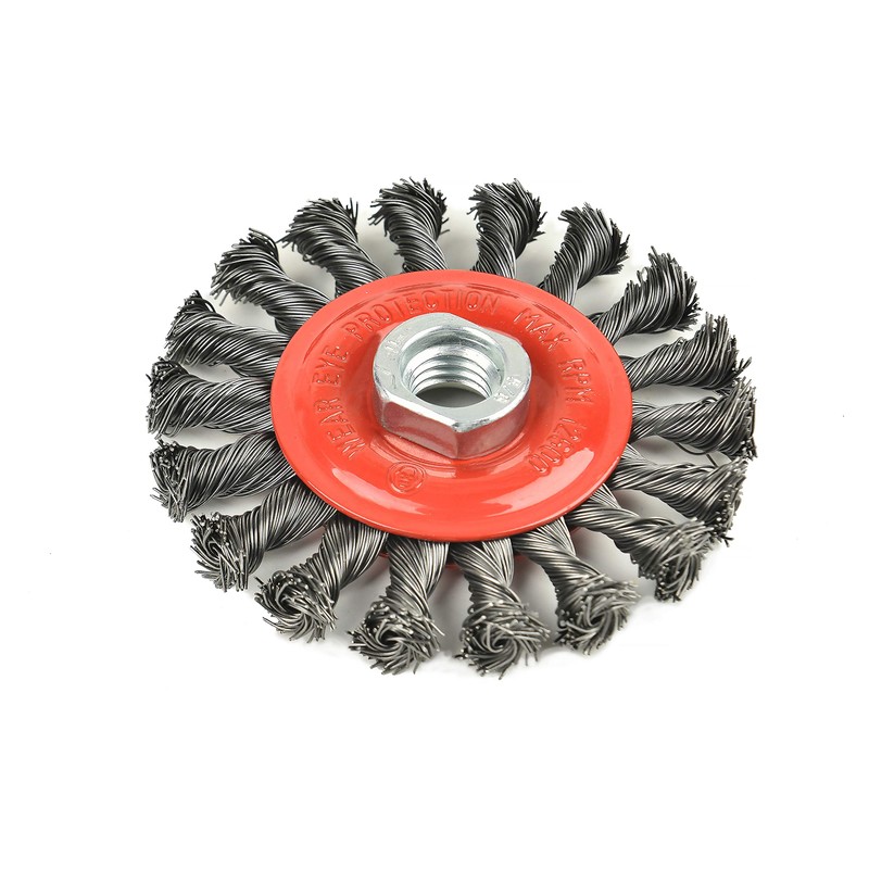 - SPECIFICATIONS: Twisted wire wheel brush runs at speeds up to 12,500 RPM and is suitable for angle grinders with 5 / 8 in 11 NC threaded shank for easy and smooth removal of severe corrosion, rust, paint, spatter and scale, while cleaning the edges of the weld to remove burrs.