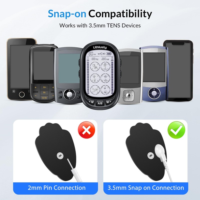 - Snap-On Compatibility – Works with 3.5mm TENS Devices: Designed with a 3.5mm snap connector, these tens unit electrode pads are compatible with major TENS & EMS brands such as AUVON, Belifu, Neocarbon, MEDVICE, and more. ⚠ Not compatible with Omron wireless units or 2mm pin-style connectors. Ensures a secure, reliable connection for uninterrupted electrotherapy sessions.