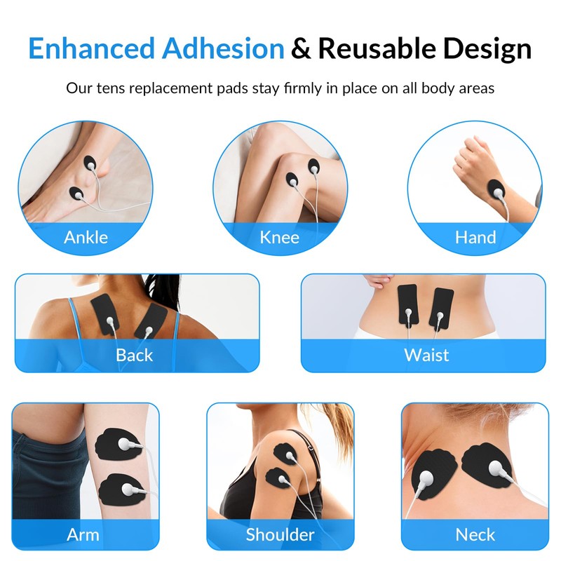- Enhanced Adhesion & Reusable Design: Made with premium imported hydrogel, our tens replacement pads stay firmly in place on all body areas, including the back, neck, shoulders, legs, and knees. Even after multiple uses and gentle washing, these gel pads maintain their strong adhesion without leaving sticky residue on the skin.