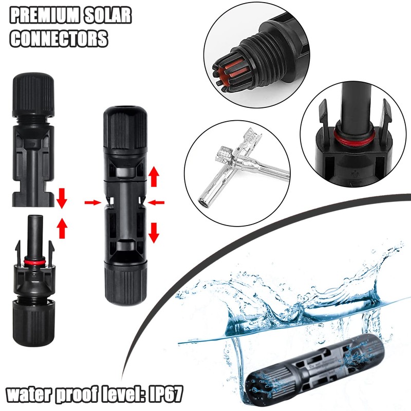 Good compatibility: compatible with PV cables with different insulation diameters (2.5 mm2 - 6 mm²). Solar panel cable connections plug, high and low temperature resistance. Solar plugs can be used in -40 °C + 90 °C. Flame retardant level: UL94-V0; Protection class: DC II.