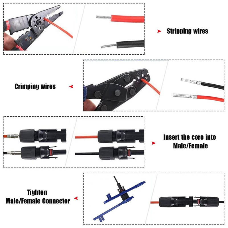 Easy installation: solar panel cable connectors, which are compatible with most photovoltaic connectors. Solar photovoltaic connector housings feature a stable and simple plug-play system with self-locking.