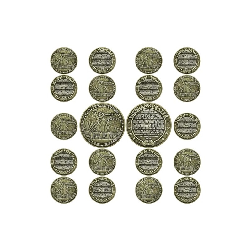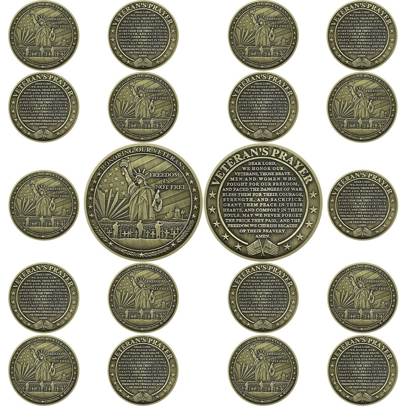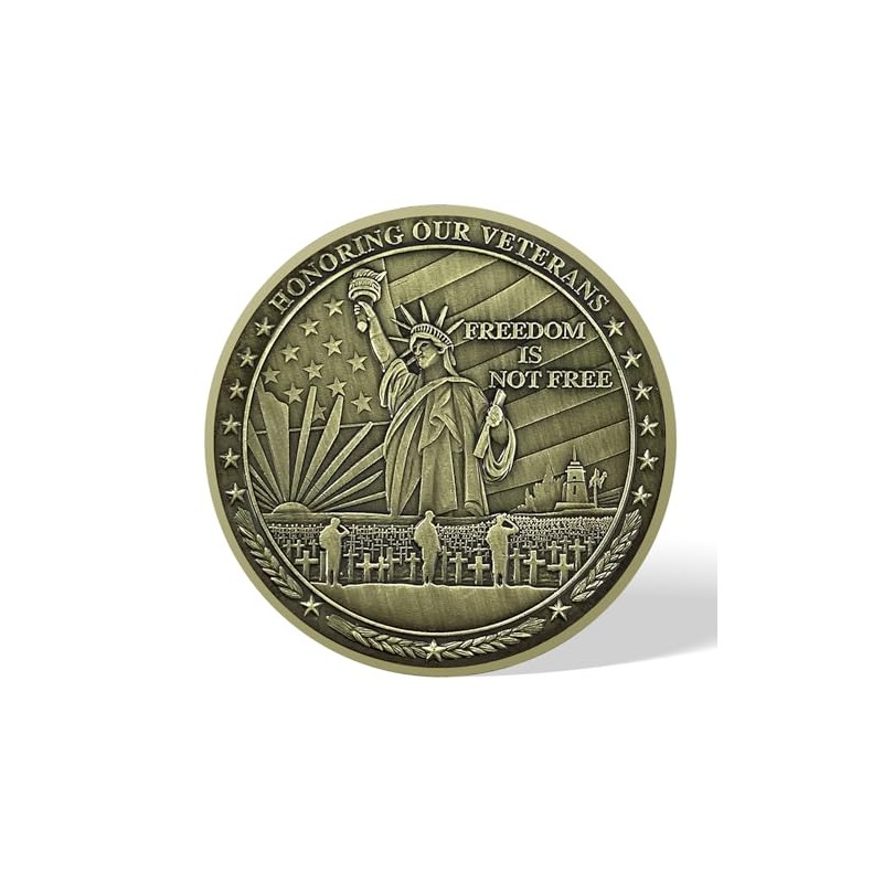 - EXQUISITE DESIGN: The Veteran Coin has exquisite designs on both sides. The military challenge coin features The Statue of Liberty, symbolizing freedom and hope, and the light in the background symbolizes light and the future. "HONORING OUR VETERANS" expresses respect for veterans, while "FREEDOM IS NOT FREE" reminds us to remember the sacrifices of veterans and that freedom is hard-won. The prayer on the back expresses blessings to veterans