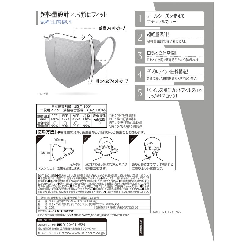 超快適マスク スマートカラー アッシュグレー 風邪・花粉用 不織布マスク ふつうサイズ 20枚入 オールシーズン カラーマスク〔PM2.5対応〕(ウイルス飛沫カットフィルタ)〔JIS規格適合審査済み〕〔全国マスク工業会 会員マーク表示〕ユニチャーム