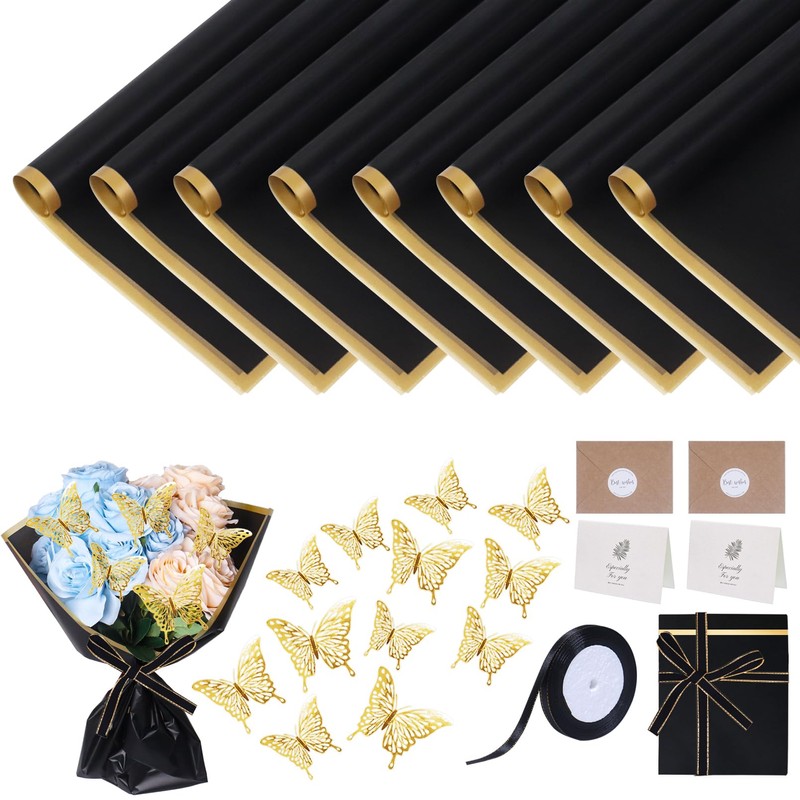 - Elegant Gift Wrapping Set: This complete set includes 20 sheets of 58× 58cm flower wrapping paper, along with matching ribbons, 12pcs butterfly decorations, and 2 cards, making your bouquet presentations stylish and sophisticated.