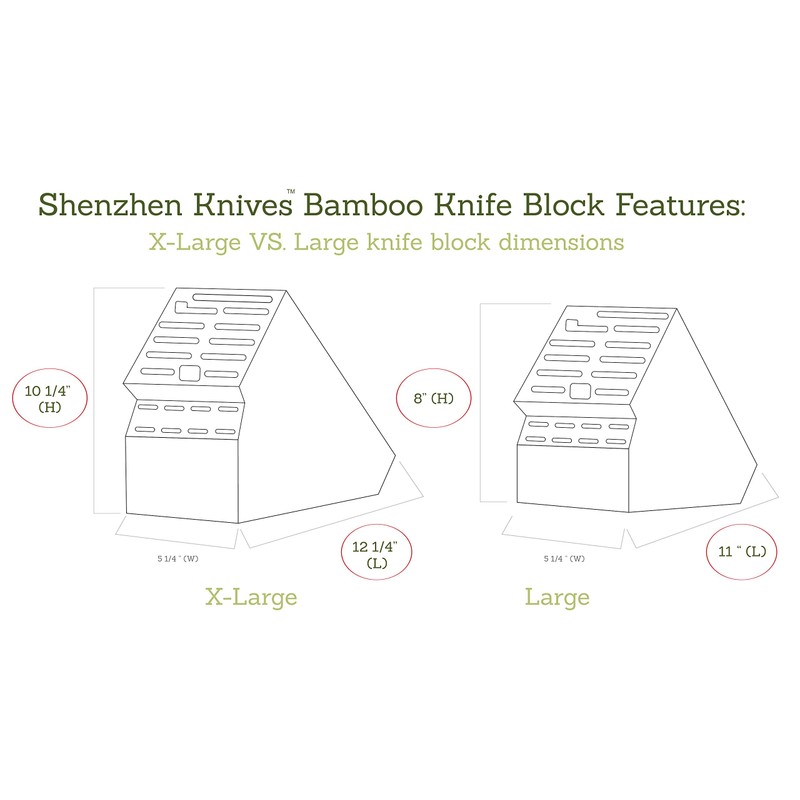 - This new X-Large size has even deeper slots to accommodate those larger items better such as scissors, chef knives and slicers. Check out our knife block measurements in the product photos to give you the assurance you need!