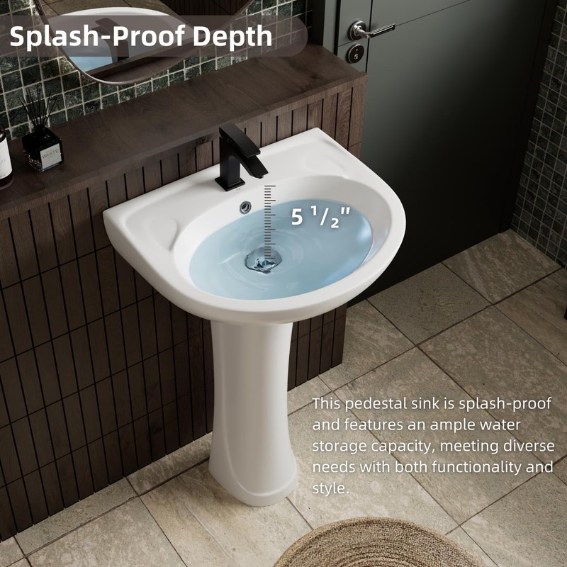 - Convenient Storage & Overflow Design: The pedestal bathroom sink features a spacious countertop for daily essentials and a 5 ¹/₂″ deep interior to reduce splashing. The built-in overflow hole with a chrome finish prevents water spills, keeping your bathroom clean and dry.