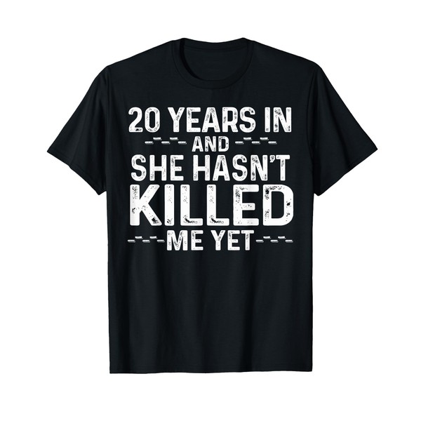 • 20 Years in & She hasn't Killed Me Yet. Great outfit for 20 years of marriage! Gift for her and him for wedding anniversary, family life anniversary party. Show your loved one, parents, how happy you are in marriage. Wedding Anniversary Matching.