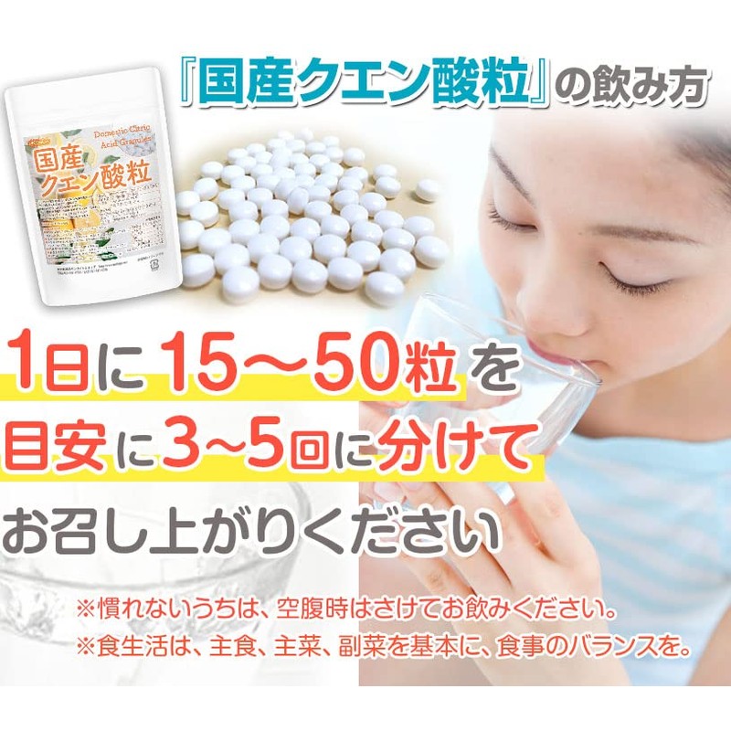 - 原材料名:クエン酸(国内製造)、粉末パラチニット/結晶セルロース、グリセリン脂肪酸エステル、セラック、微粒二酸化ケイ素、タルク、カルナウバロウ 内容量200g(180mg×約1100粒)1粒 国産クエン酸120mg