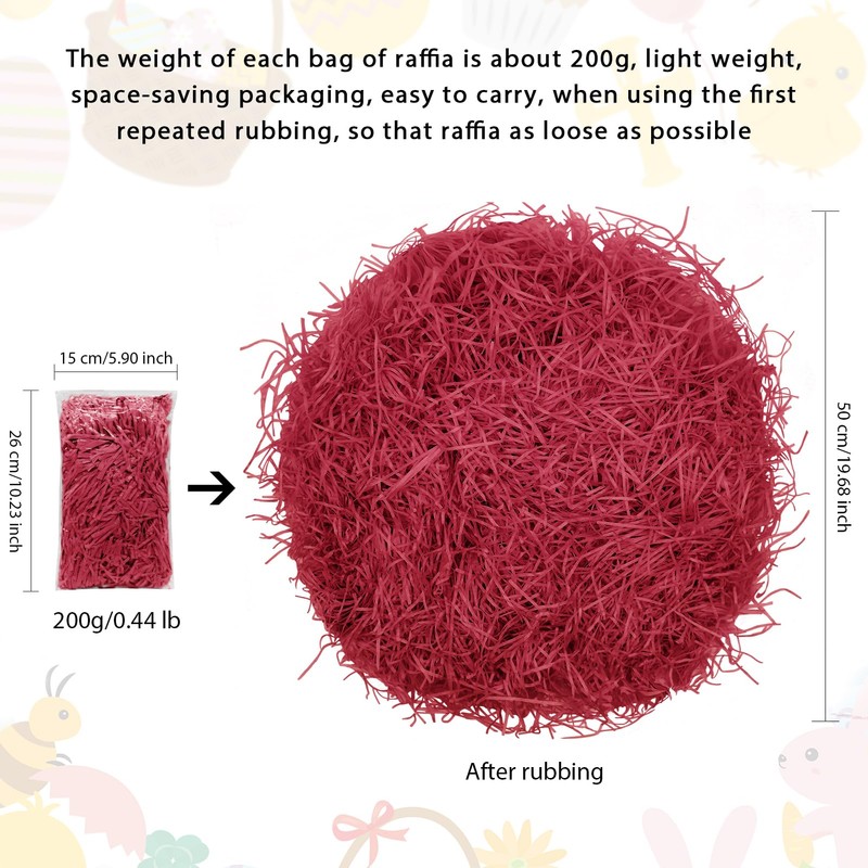 - Weight: each Raffia filling material gift weighs approx. 200 g, lightweight and space-saving to store and easy to carry. Reminder: wipe the crushed paper repeatedly to make it as loose as possible