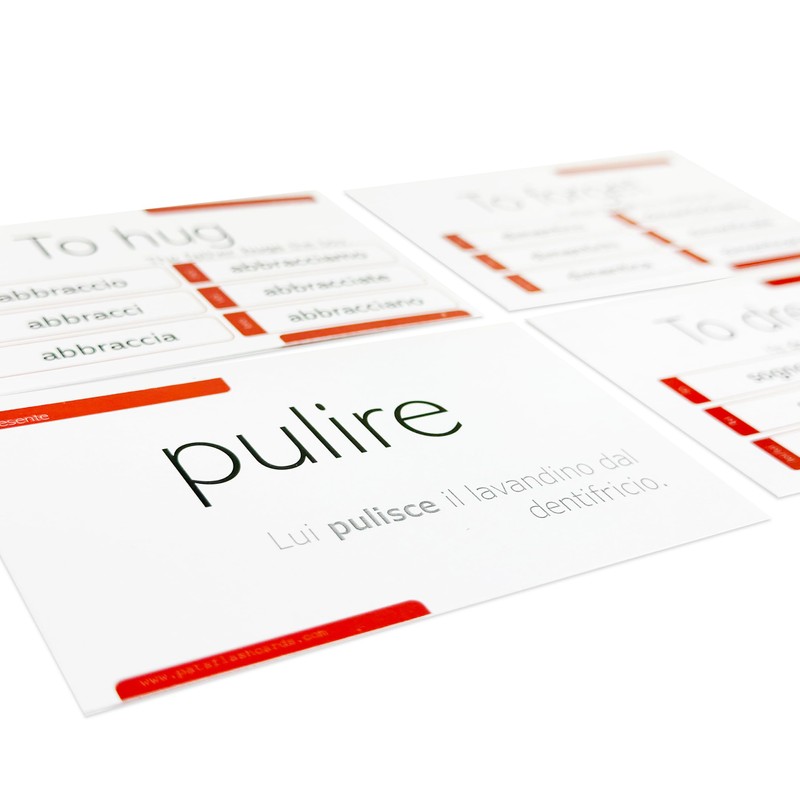 - Designed for students and self-learners, these cards are specifically catered for both children and adults to improve their vocabulary of Italian verbs and boost their experience with conjugations. All the example sentences in these cards use the vocabulary from our other products and are an excellent supplement to our set of Italian picture vocabulary flash cards.