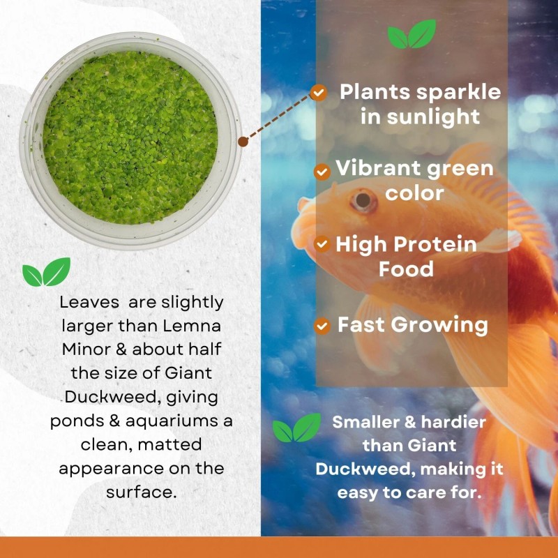High-protein live duckweed—loved by koi, goldfish, guppies & other freshwater fish. This duckweed plant serves as a natural live feed and a source of shade and shelter for aquatic animals.