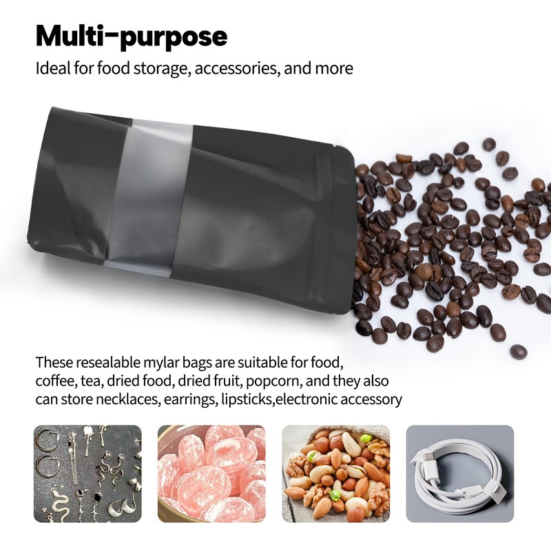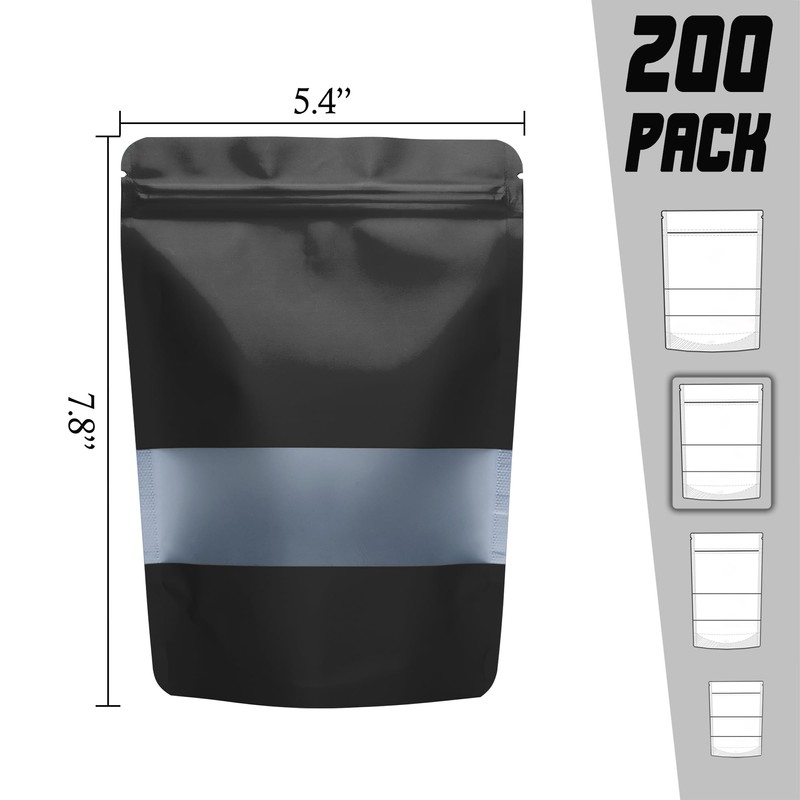 200 Pack Food Storage Bags, Foil Pouch Resealable Bags with Matte Window, Stand Up Sealable Bags for Packaging, 5.4"×7.8" Black