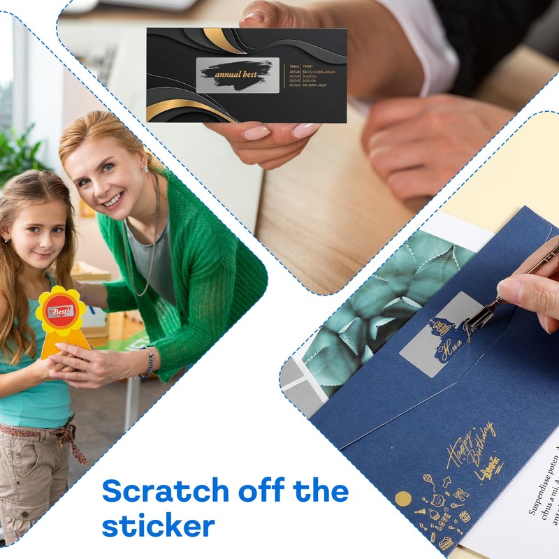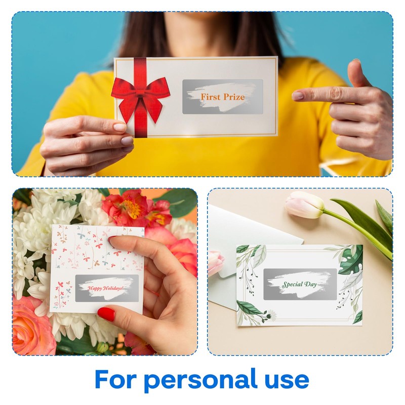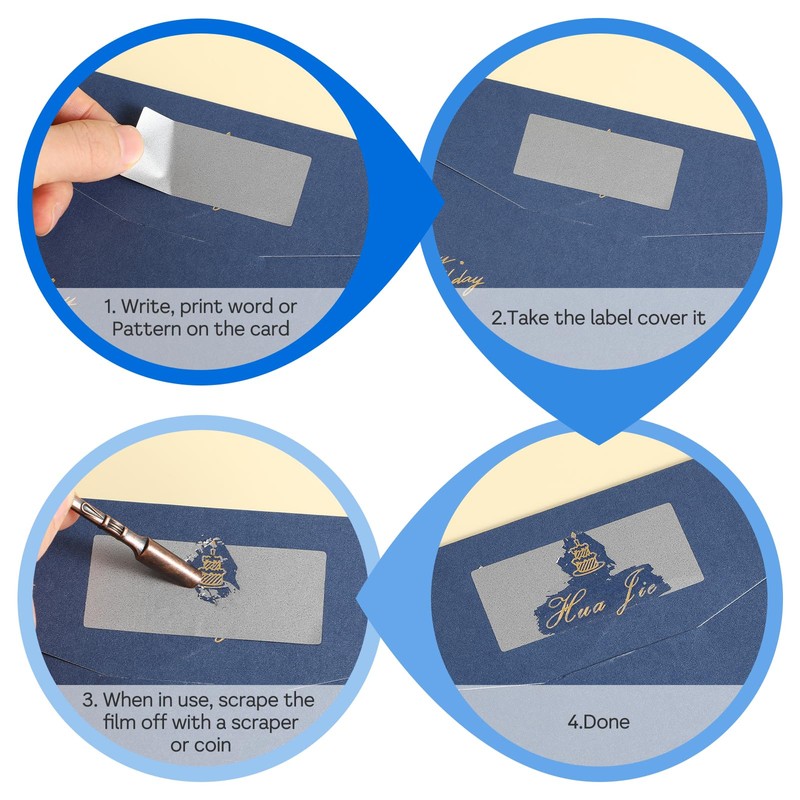 - HOW TO USE: Print/write your content on any sheet of paper/card, paste the rectangle adhesive label over your content, just like an ordinary sticker, then scratch with a coin to reveal your content. The film between the text and the scratch layer protects your content.