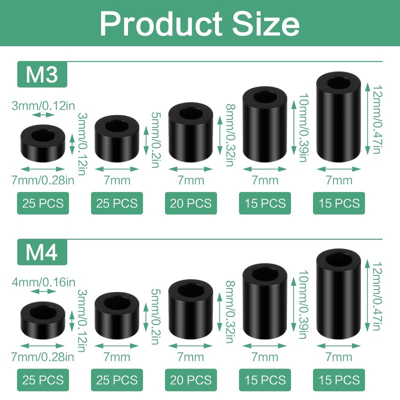 - 【Specification】: You can get 200 pcs standoff spacers and a storage case! This kit includes 25pcs x 3*7*3mm, 25pcs x 3*7*5mm, 20pcs x 3*7*8mm, 15pcs x 3*7*10mm, 15pcs x 3*7*12mm, 25pcs x 4*7*3mm, 25pcs x 4*7*5mm, 20pcs x 4*7*8mm, 15pcs x 4*7*10mm, 15pcs x 4*7*12mm spacers. Different sizes of spacers are classified well in the storage case, easy to find!