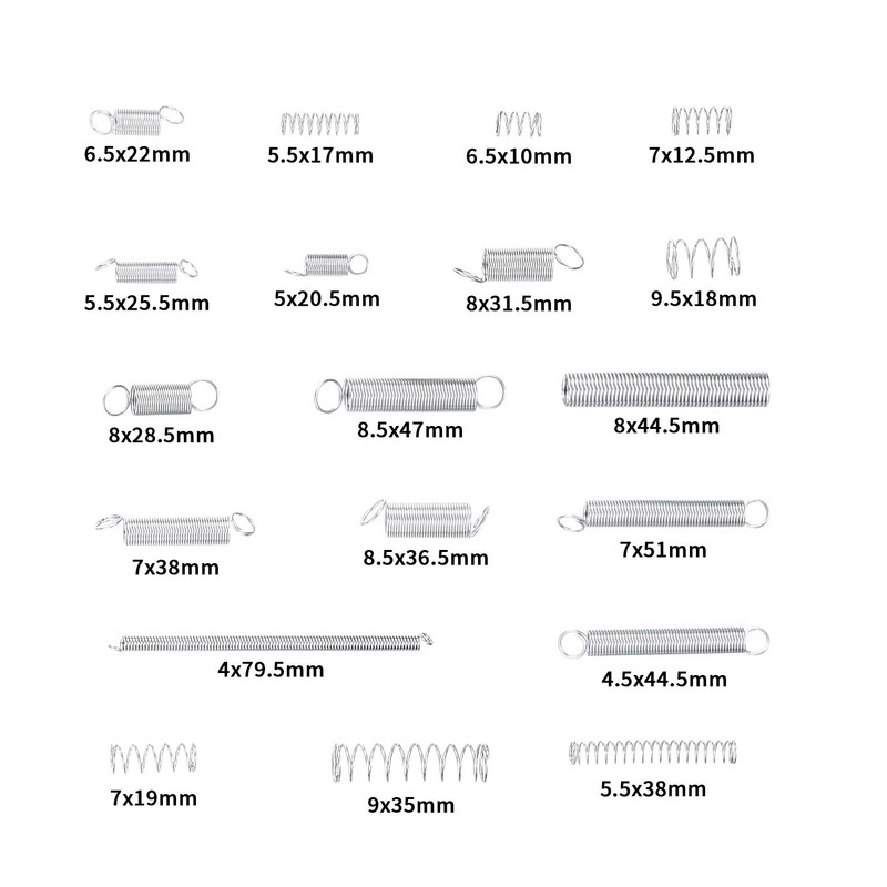 - 8 sizes of compression springs and 12 sizes of extension springs can meet different needs.