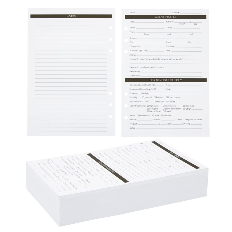 - Beauty Salon Supplies: The top half of the cards are filled by clients with contact information and notes; the bottom is filled by stylists with the clients' hair information to keep as a record