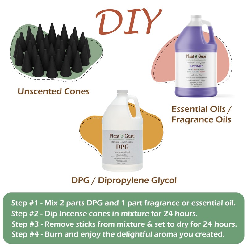 • ✅ INCENSE RECIPE - Mix 2 parts DPG and 1 part fragrance or essential oil - Dip Incense cones in mixture for 24 hours - Remove cones from mixture and let dry for another 24 hours. - Once fully dried, burn and enjoy the delightful unique aroma you created.