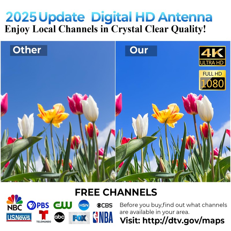 • CUT CABLE BILLS FOREVER- Say goodbye to expensive cable bills! Access FULL HD local channels like ABC, CBS, NBC, CPS, FOX, CW, ION, UMAS and more FREE – no monthly fees. Supports 4K Ultra HD, 1080P & 1080i broadcasts for crystal-clear news, sports, shows & movies.This indoor tv antenna helps you receive any channel you want.