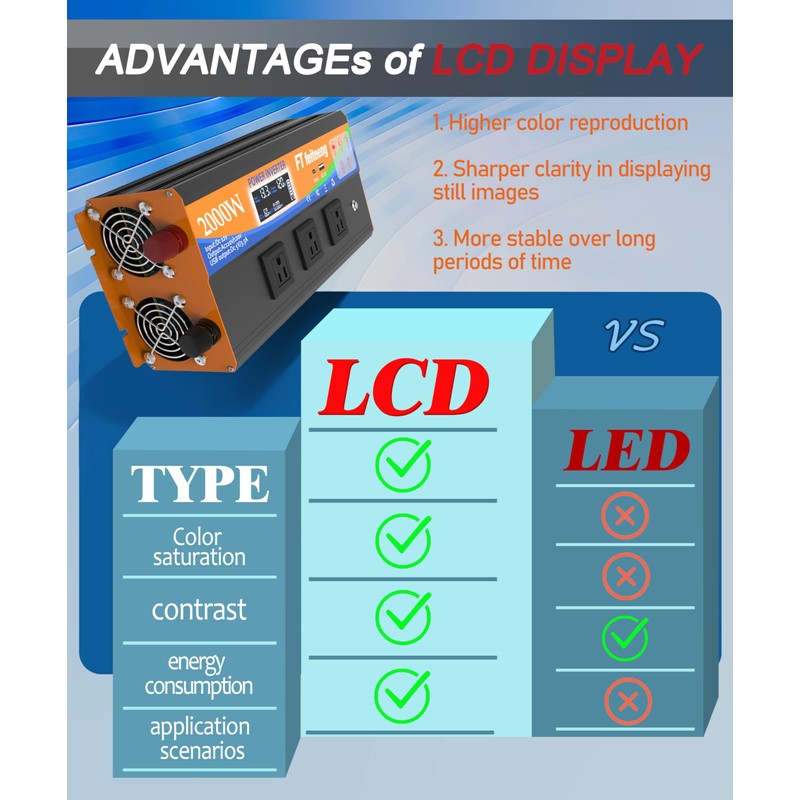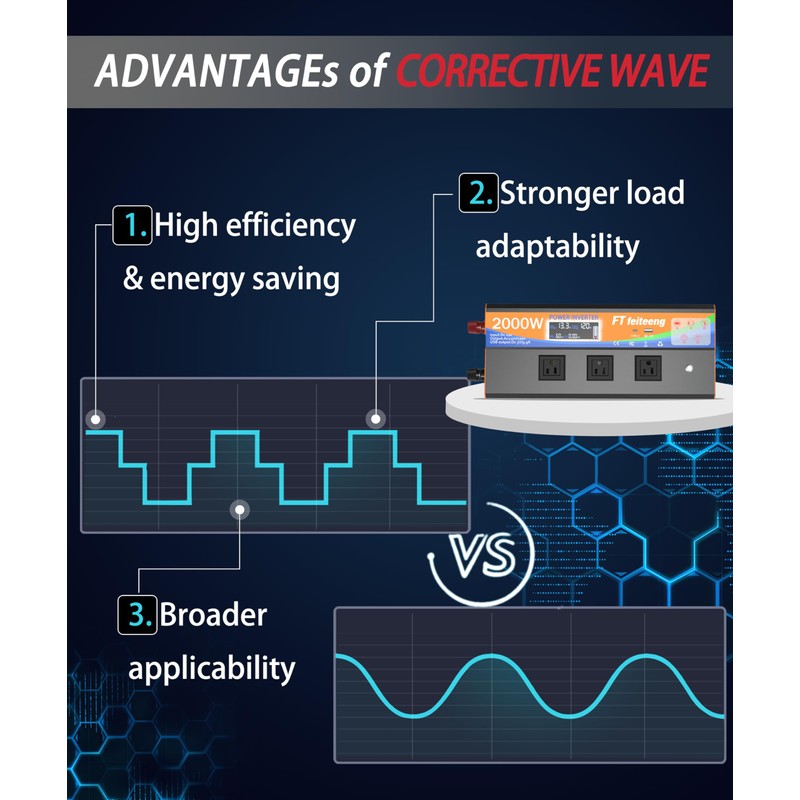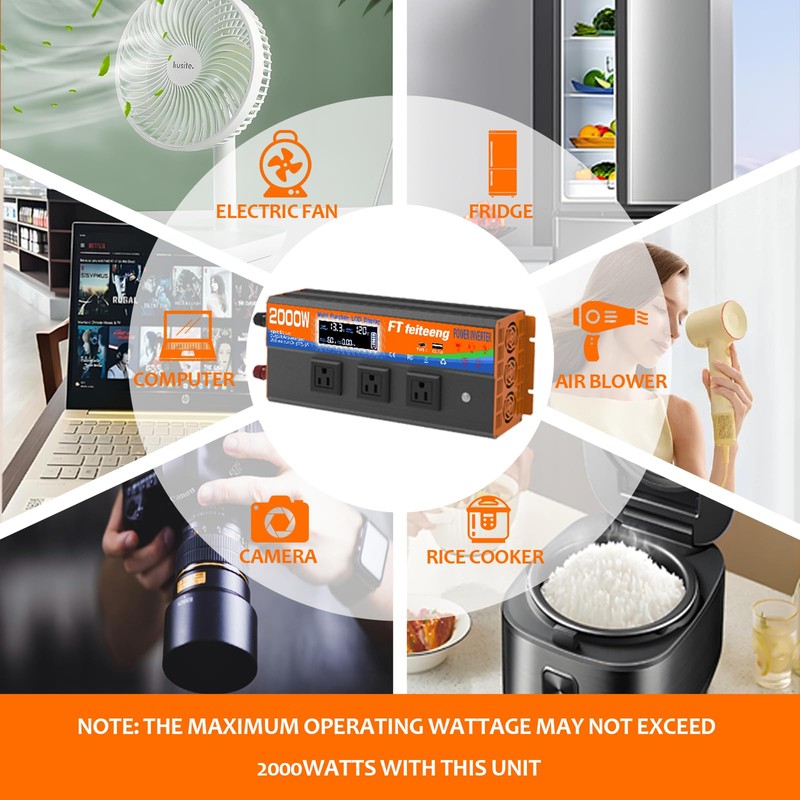 • 【2000W/4000W (Peak)】 Pure sine wave inverter with ultra-high efficiency conversion efficiency converts 12V DC to 120V AC, effectively reducing no-load loss and operating power consumption