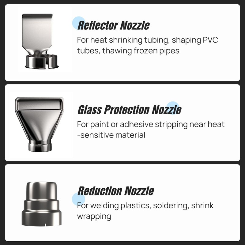 - ♛With 4 Nozzles: The heat gun comes with 4 nozzles, which is reflective nozzle, deflector nozzle, large concentration nozzle and small concentration nozzle.