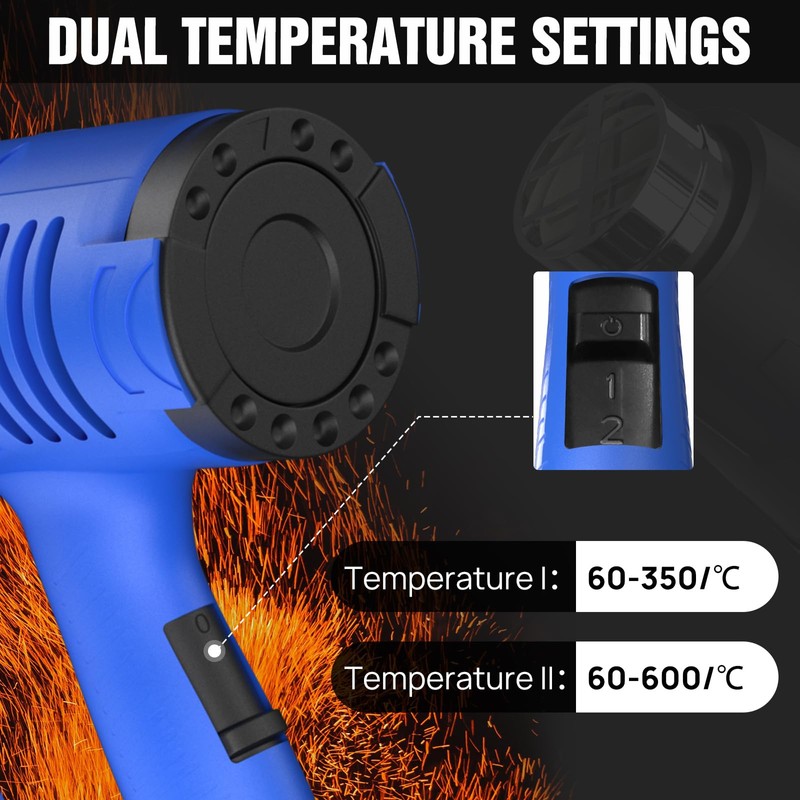 - ♛Dual-Temperature Setting: The heat gun features 2 temperature modes: mode 1 (low setting 300℃, 300L/min), mode 2 (high setting, 600℃, 500L/min). The different temperature can be adjusted for different tasks.
