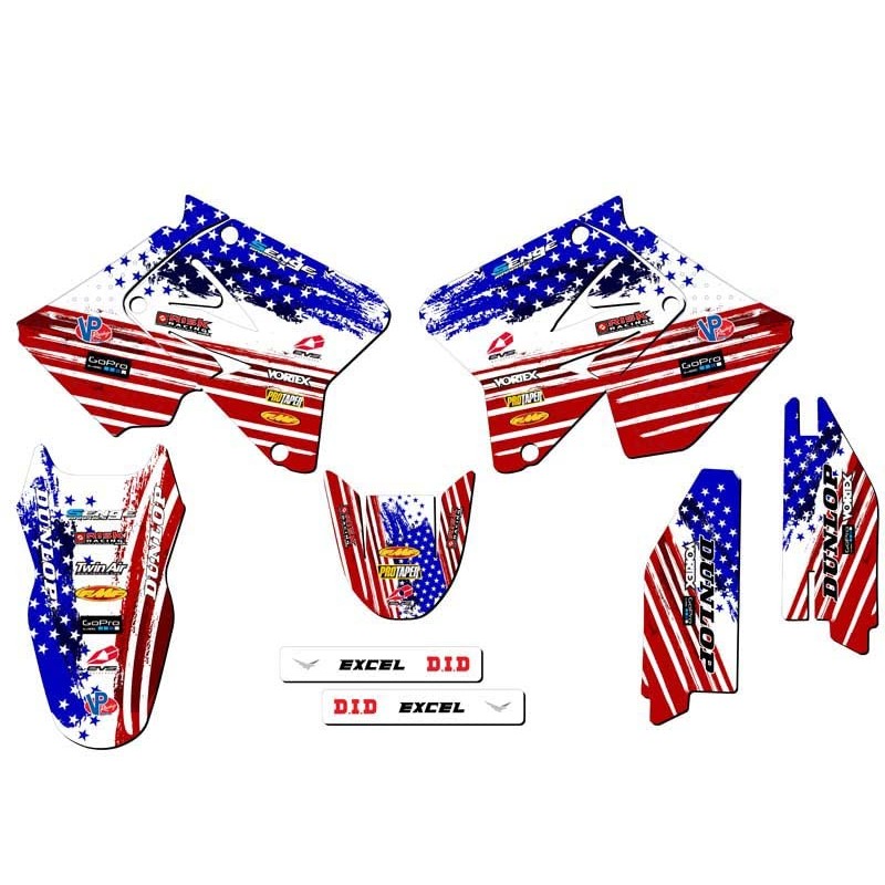 - 2001-2014 RM 125 MERICA Usa Senge Graphics Kit Compatible with Suzuki. The photo shown shows the exact decals you will receive. Please refer to the photo to make sure you are getting the exact amount of coverage you want. You can toggle between base, complete, and rider I.D. to see all of the differences.
