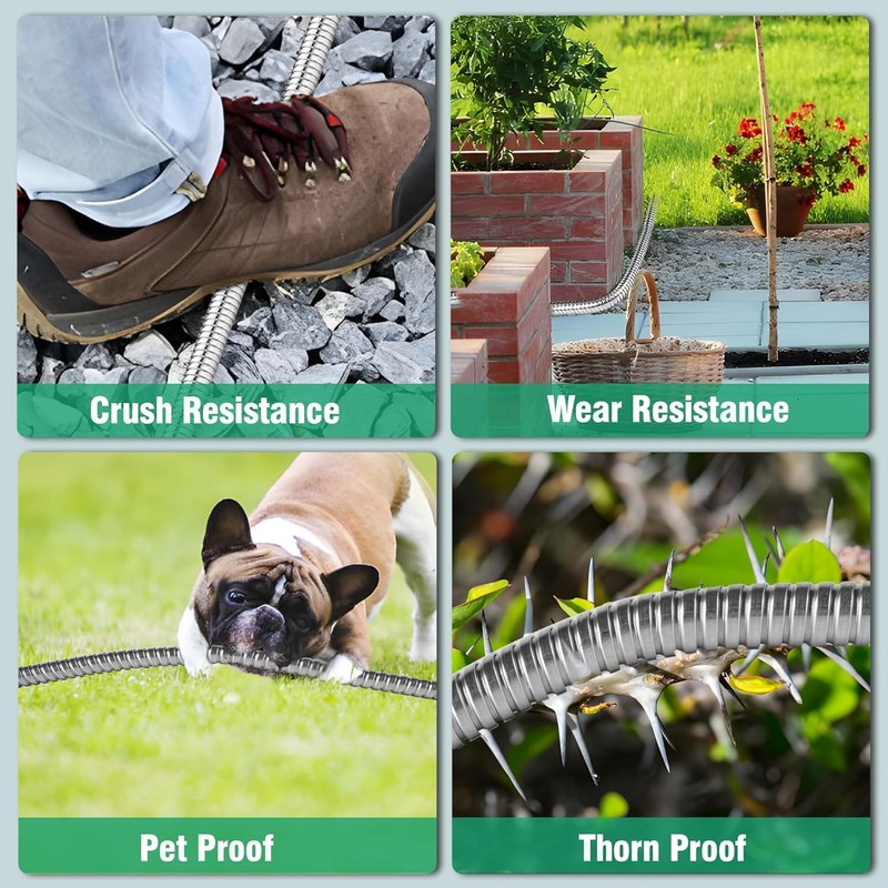 - Ultra Durable Stainless Steel: The upgraded design metal garden hose is crafted from stainless steel and reinforced PVC material. The stainless steel outer casing exhibits exceptional corrosion resistance and rust-proof properties. Whether facing challenges like pet bites, wall abrasions, thorn punctures, or the test of wire mesh, it effortlessly withstands. The high-strength, pressure-resistant premium PVC core ensures the water pipe remains steadfast, eliminating the risk of pipe bursts.