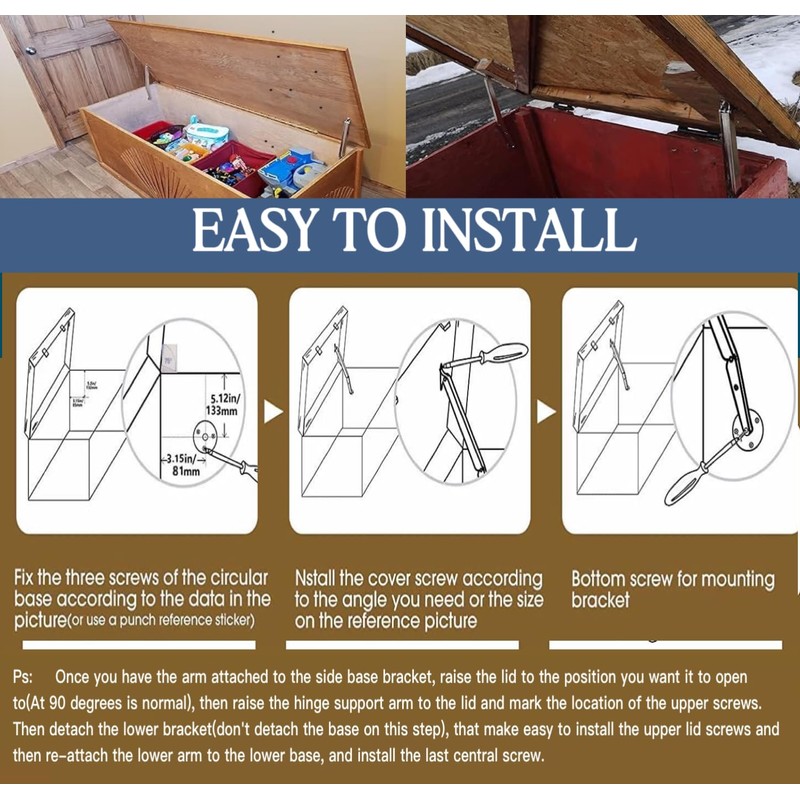 - 【 SLOW CLOSE LID SUPPORT HINGES 】It's soft close hinges for heavy lid. Excellent soft close and safety solution for heavy lid chest hinges, huge toy box hinges. Lid support hinge will hold the heavy lid opened until you push it down, then slow close gently to avoid to slam shut and crush the fingers. Good product fit for the large toy box or chest.