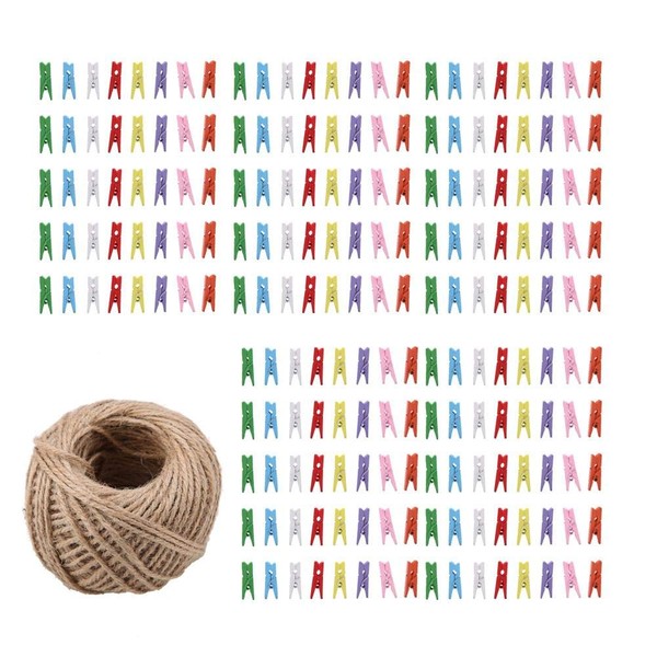 200Pcs Colorful Wooden Clothespins, Mini Wooden Photo Clips Craft Hanging Peg Pins with 50M Jute Twine