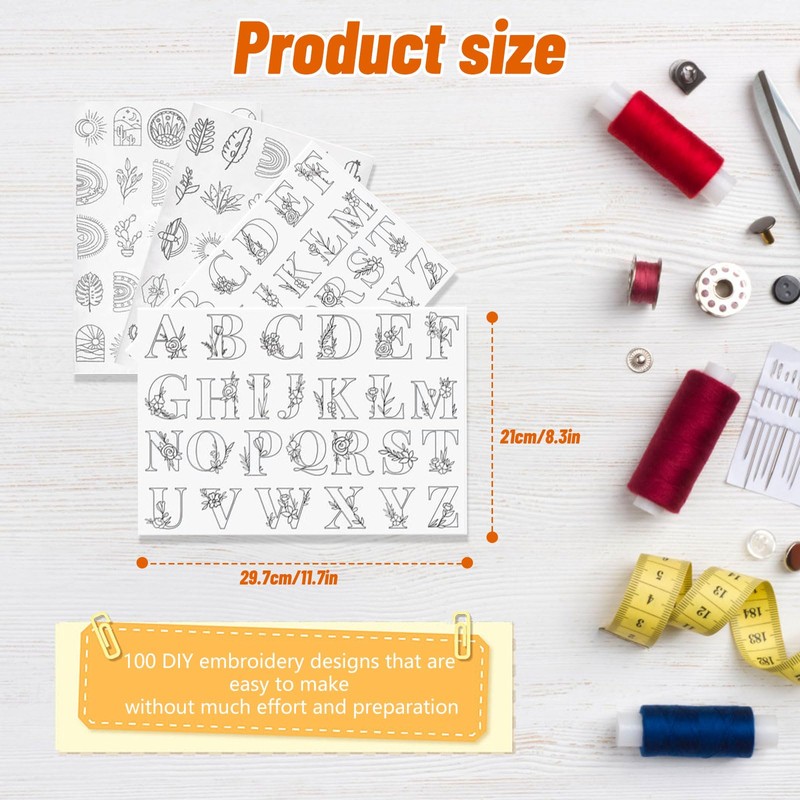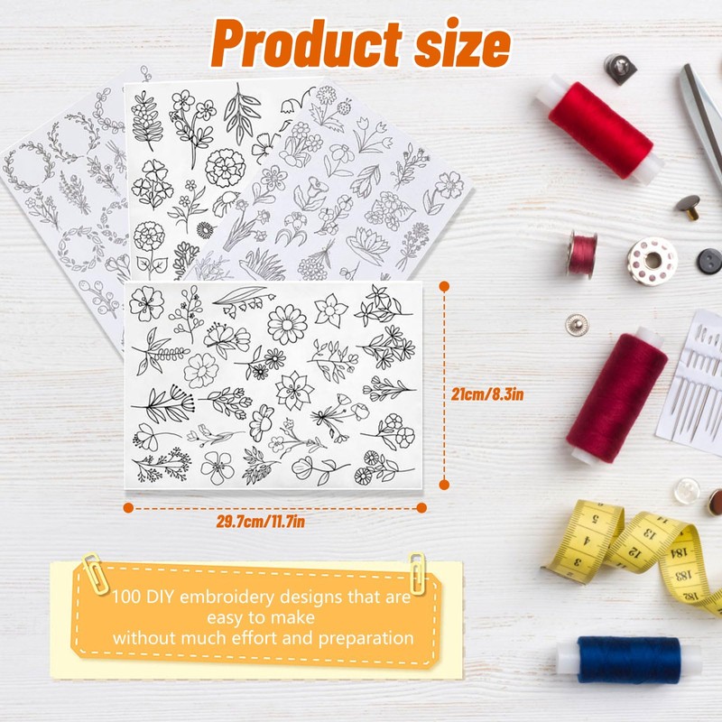 - 🌸EASY TO START: There are a total of 100 embroidery designs on 4 sheets of A5 water-soluble embroidery foil, just peel the pattern from the back of the lining, stick the pattern to the fabric or clothes you want to decorate, and start embroidery; Rinse several times with warm water and it will show a beautiful pattern after drying. Embroidery stencils are suitable for beginners as pattern DIY kits.