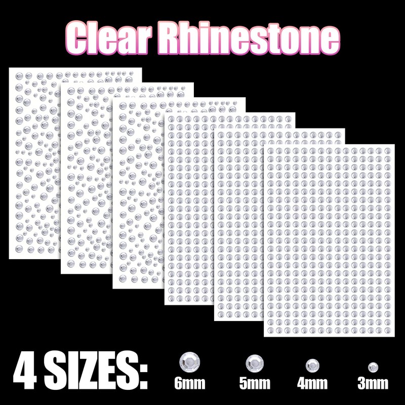 - ✨PACKAGE CONTAINS -- You will receive 6 sheets of CLEAR rhinestone stickers with 4 sizes(3/4/5/6mm); And 1 pc of quick dry makeup glue.