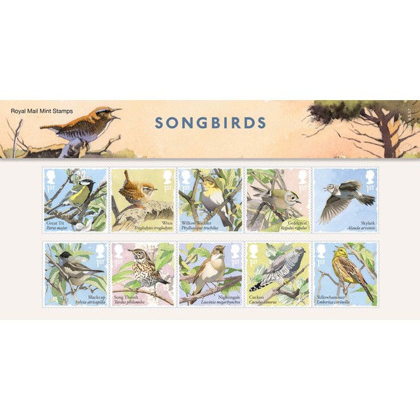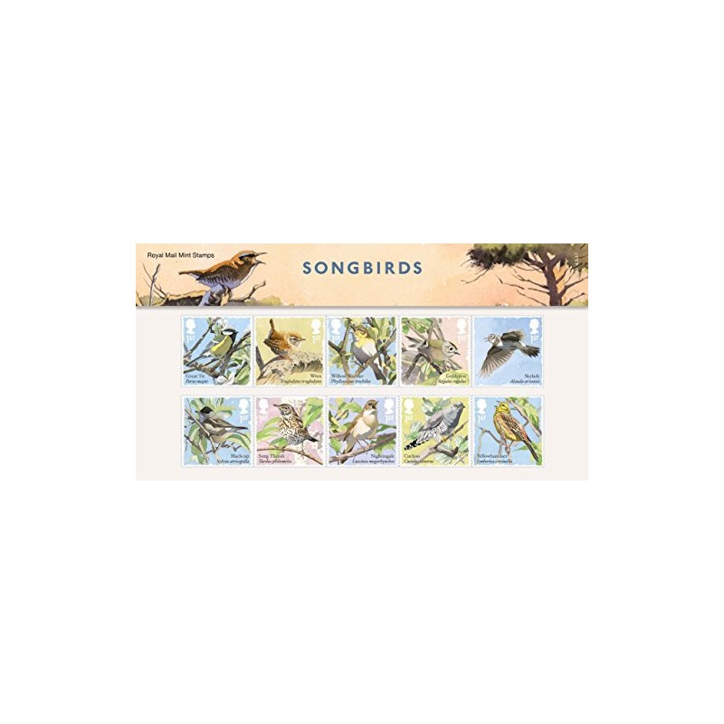 • These delightful 1st Class mint stamps feature some familiar songbirds; Great Tit, Wren, Willow Warbler, Goldcrest, Skylark, Blackcap, Song Thrush, Nightingale, Cuckoo, Yellowhammer