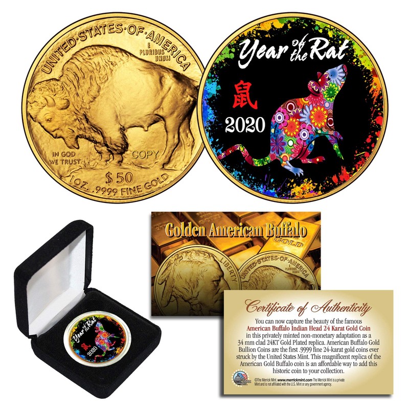 This CHINESE NEW YEAR 2020 – YEAR OF THE RAT COIN is lucky money and a treasured collectible. Here is your chance to own or gift a beautifully colorized famous YEAR OF THE RAT 24KT Gold Plated American Buffalo Indian Tribute Coin. This high-quality coin has been layered in Genuine 24 Karat Gold, and then enhanced with beautiful colorized images using a unique painstaking multicolor authentic process. Colorizing coins involves the unique application of special inks directly to the surface of a coin that achieves a level of detail, color saturation, and durability that is #1 in the coin industry. The result is an everlasting colorized coin collectible of ultra-high quality. Each coin comes in a premium coin capsule with a Certificate of Authenticity.