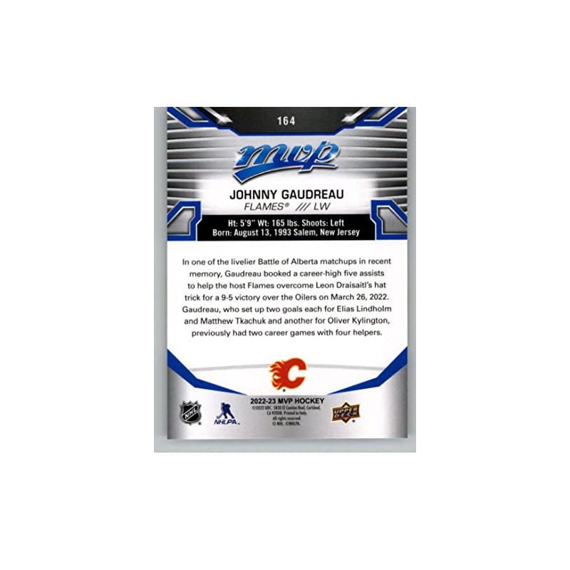 - 2022-23 Upper Deck MVP Hockey #164 Johnny Gaudreau Blue Parallel Hockey Card