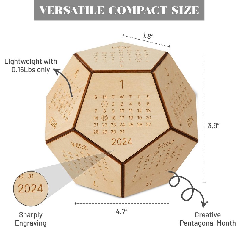 - NOVELTY DESK ACCESSORIES: This one-of-a-kind wooden hexagon shaped desk calendar 2024 was created to stand out from the crowd of calendar options. The precise name for this novel geometry is a dodecahedron. The wood calendar itself has 12 sides for the entire year, and the covers are made entirely of natural wood.