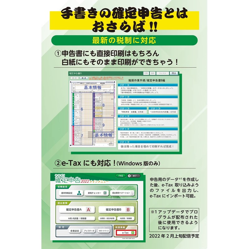 - e-Tax: You can create declaration data that can be submitted by the National Tax E-Declaration and Tax System (Eetax), so you can declare slowly at home. Only the Windows version