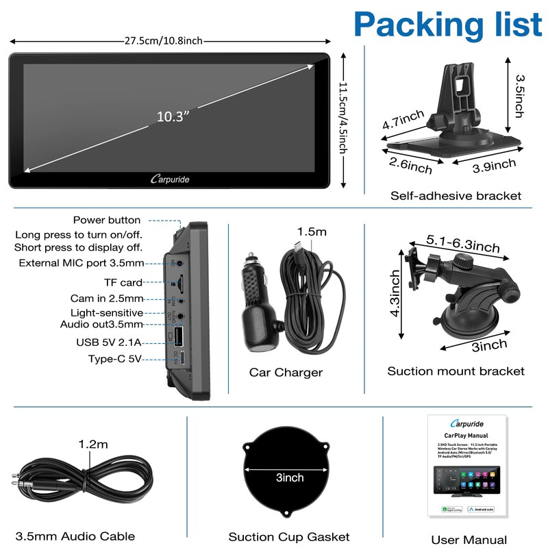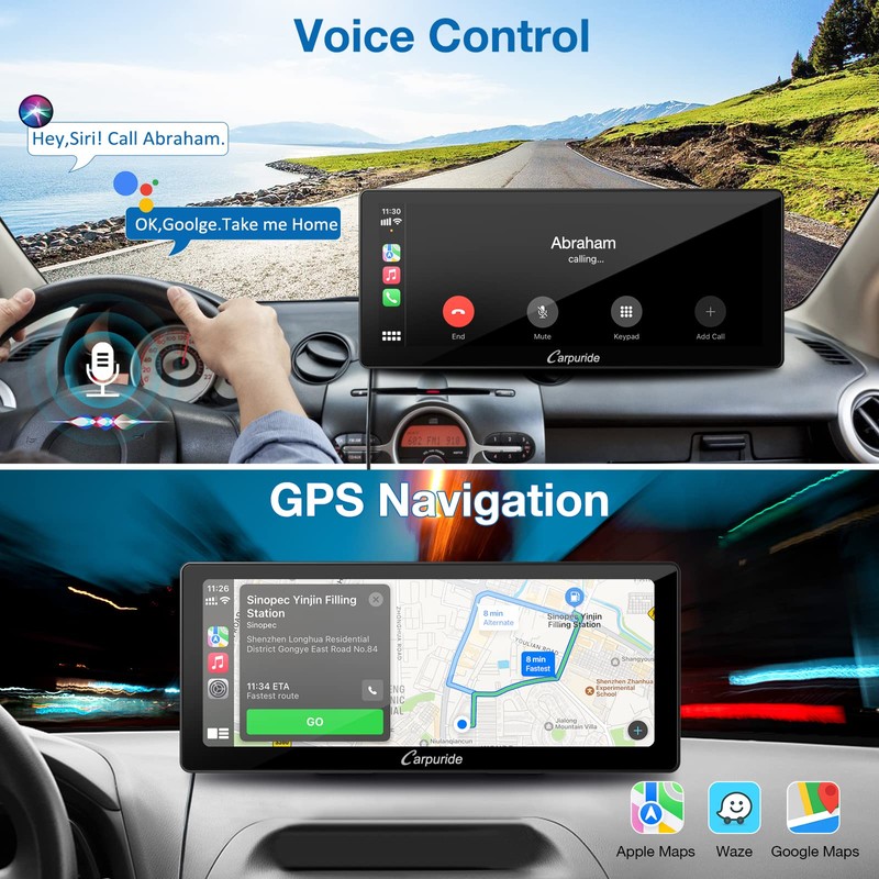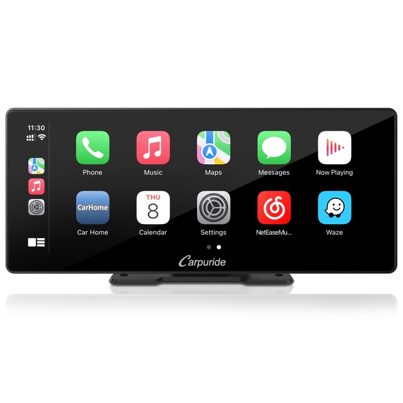 - Wirelessly 10.3 inches IPS Smart Display - Carpuride 103 portable car stereo compatible with Apple Carplay & Android Auto. After link wirelessly, puting all your phone’s best features in a clean, safe, and easy-to-use hd touchscreen, wirelessly handle gps navigation, messaging, phone calls, bluetooth music, Siri. Never worry about heating and battery damage caused by using your mobile phone for navigation for a long time.