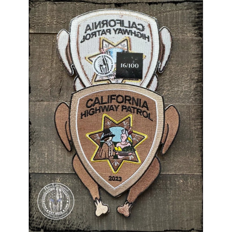 This is the unofficial Limited Edition 2023 Thanksgiving CHP Patch. It is a woven patch similar to the shoulder patches worn by CHP Officers. This is a 5” novelty collector patch with no backing.