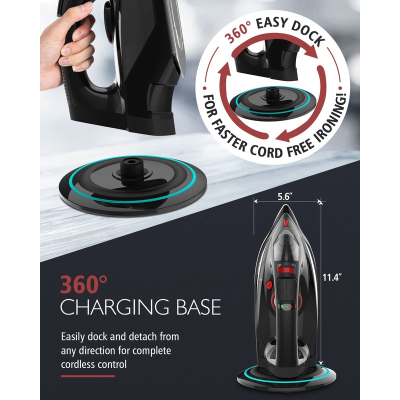 - UPGRADE DESIGN - OMAIGA 1500W iron cordless without the hassle of the cord. Ironing has never been more unrestricted. Without any wires to get in your way, you can enjoy the convenience of cordless and get stuck into your ironing. Unique 360 power+ base with LED lights, easily dock and detach from any direction for complete cordless control.