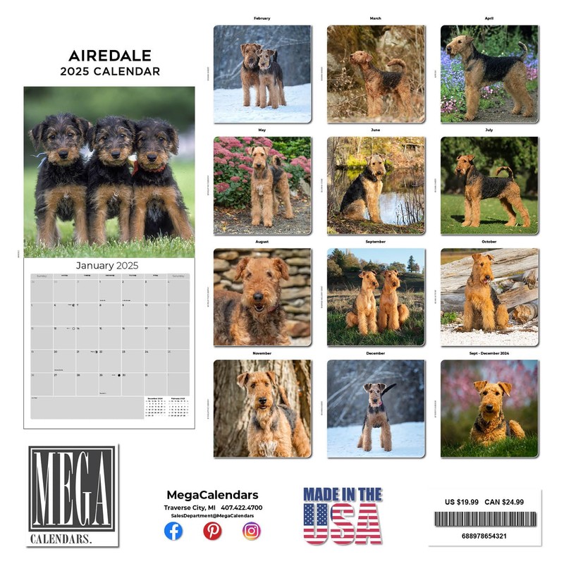 - BONUS SEPT - DEC 24 INCLUDED - Hanging monthly wall calendar from SEPTEMBER 2024 - DEC 2025. A square calendar of beautiful Airedale Terriers is ideal for creating a comfortable look in home & office. Size Closed: 12 W x 24 H, Size Opened: 12 W x 24 H.